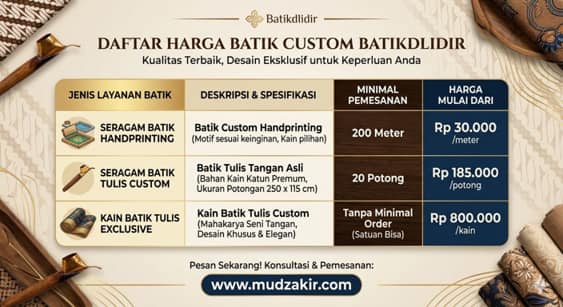 Jika Anda ingin berdiskusi atau memilih dengan tenang, Anda bisa menghubungi WhatsApp 0822 6565 2222 Pak Muzakir. Untuk kebutuhan seragam batik tulis premium tersedia mulai Rp 185.000,- dengan minimal order 20 potong.
