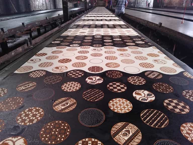 Setelah semua disetujui, produksi massal dimulai di meja panjang. Proses hand-printing dilakukan dengan ketelitian tinggi agar sambungan motif tidak terlihat putus.